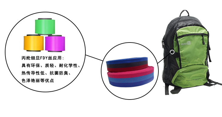 箱包、織帶用丙綸FDY絲具有環保、質輕、耐化學性、熱傳導性低、抗菌防臭、色澤艷麗等優點。